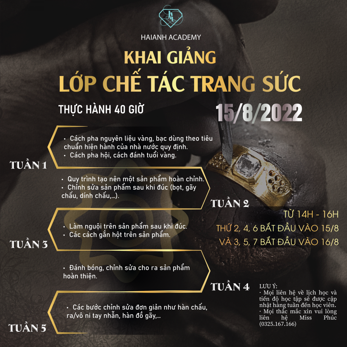 Khi muốn kinh doanh ngành trang sức, hay chỉ là đam mê tìm hiểu đến ngành kim hoàn. Bạn chưa biết tim hiểu ở đâu, thì hãy đến với Hải Anh Academy, chúng tôi có mở khóa học mới dành cho lớp chế tác trang sức. Tại đây bạn có thể được học về tuổi vàng, quy trình làn ra một sản phẩm hoàn chỉnh. Góp phần giúp bạn đánh giá cơ bản được giá trị sản phẩm cũng như là trở thành một thợ kim hoàn.