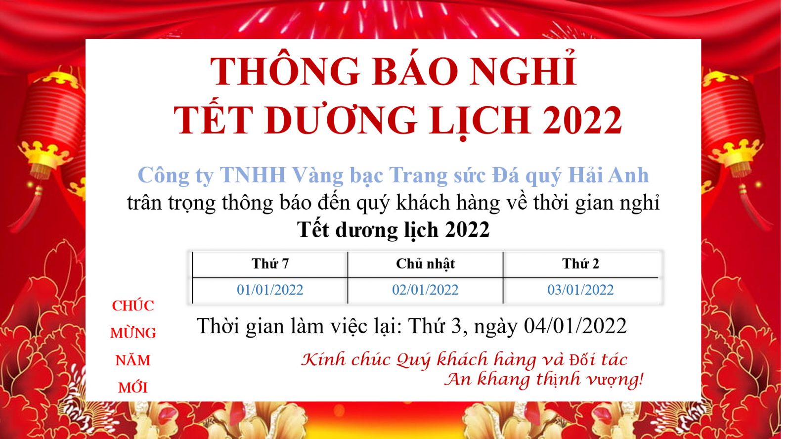 Công ty TNHH Vàng bạc Trang sức Đá quý Hải Anh xin trân trọng thông báo đến quý khách hàng thời gian nghỉ Tết dương lịch 2022.